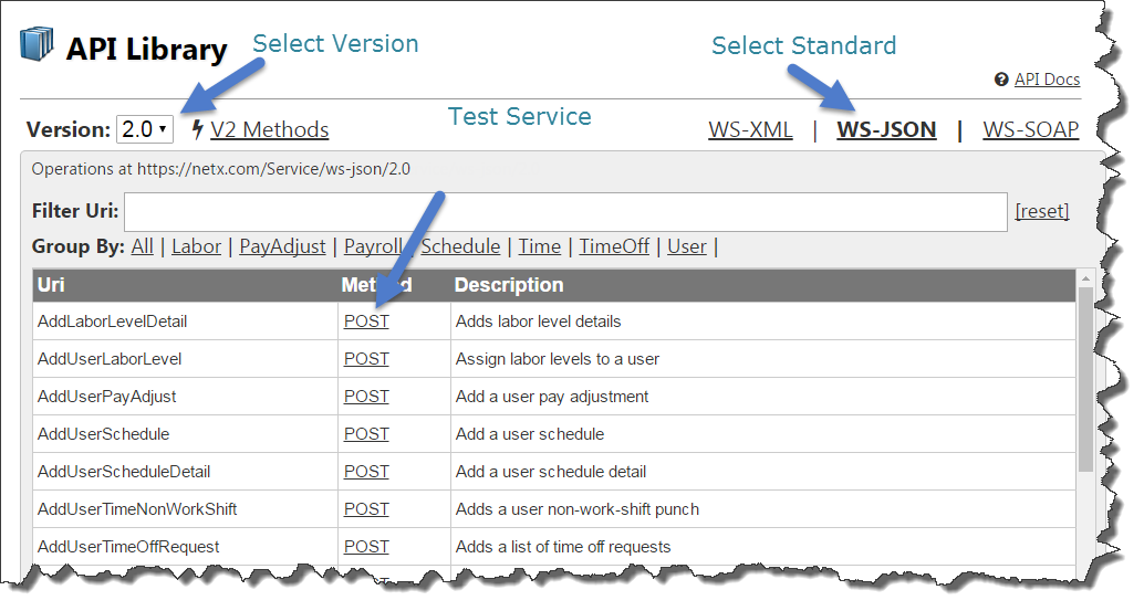 the Save link. Some web service methods such as PUT and POST require that a payload be sent. For XML and JSON standards you can click the XML or JSON payload links to create a template of the web service. Clicking the submit