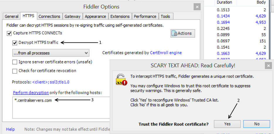 Under the “HTTPS” tab, ensure that it is configured to Capture and Decrypt HTTPS traffic. When you select “Decrypt HTTPS Traffic” (1) a message will be displayed