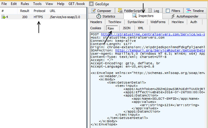 In the capture pane you should see something similar to the screenshot below. Select the call to the web service URL and on the right side of the screen ensure that